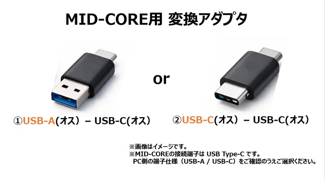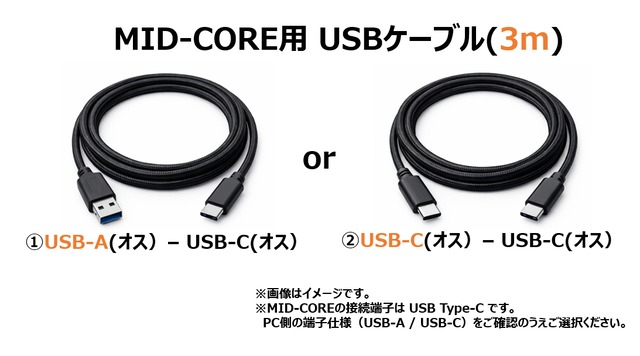MID-CORE Flex/One 使用時にはPCとの接続に、USBケーブルまたは変換アダプタが別途必要となります。 これらはお客様にてご用意いただくか、本オプション製品をご利用ください。 MID-CORE Flex/Oneの接続端子は USB Type-C(メス) です。 PC側の端子仕様(USB-A / USB-C)をご確認のうえご選択ください。 ※画像はイメージです。